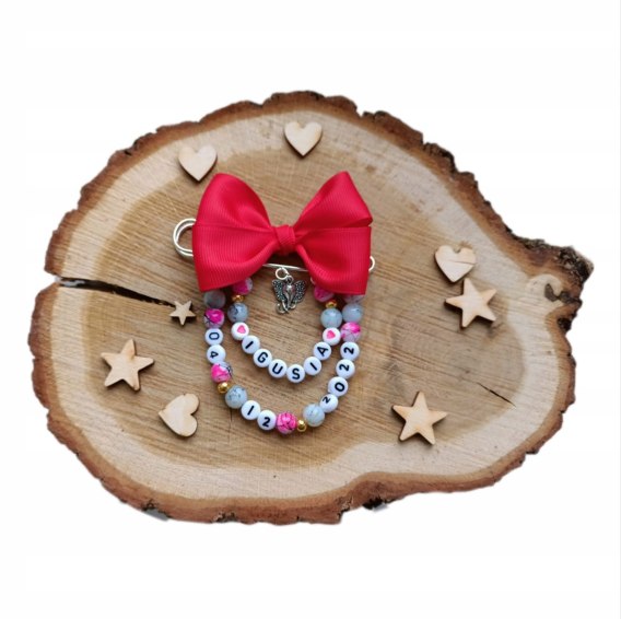❤️ Proszę mieć na uwadze, że ze względu na długość imienia układ i ilość koralików może się różnić. Ilość koralików muszę dopasować w taki sposób aby całość dobrze się układała na wózku.