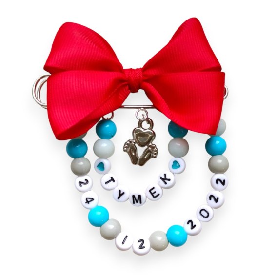 Broszka do wózka agrafka z imieniem i datą NIEBIESKA, SZARA