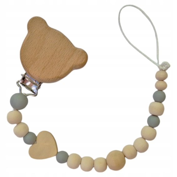 Zawieszka do smoczka składa się ze sznurka nylonowego, drewnianych oraz silikonowych koralików i drewniano metalowego klipsa!